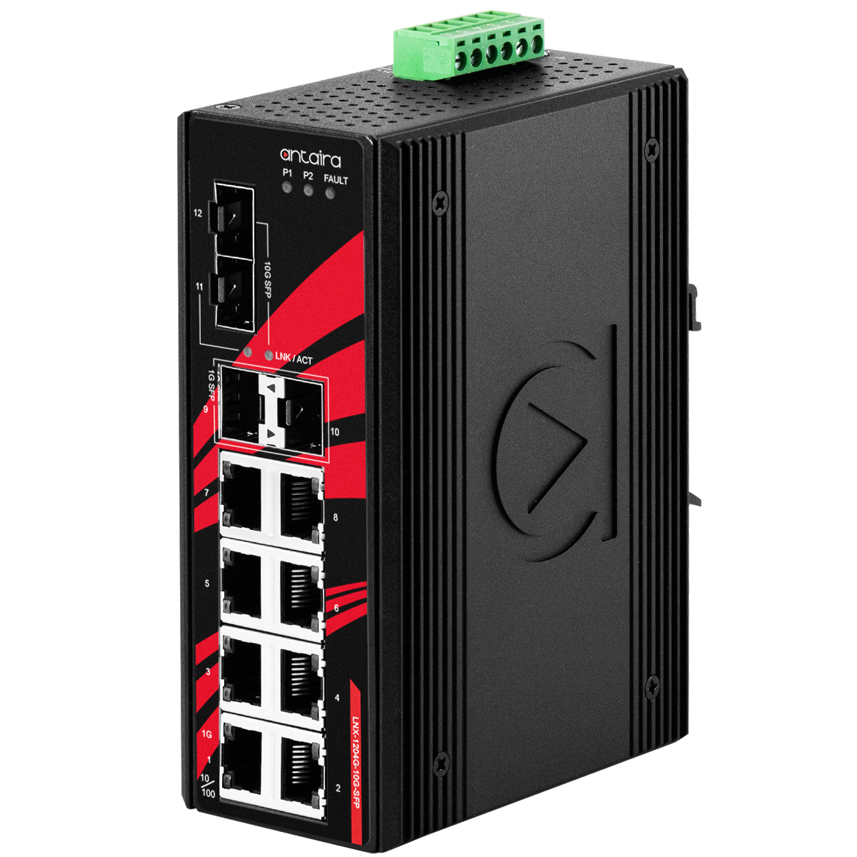 LNX-1204G-10G-SFP 12-Port Industrial Gigabit Unmanaged Ethernet Switch, with 8*10/100/1000Tx, 2*1G SFP Slots, and 2*10G SFP+ Slots operating temperature -40°C~65°C.
