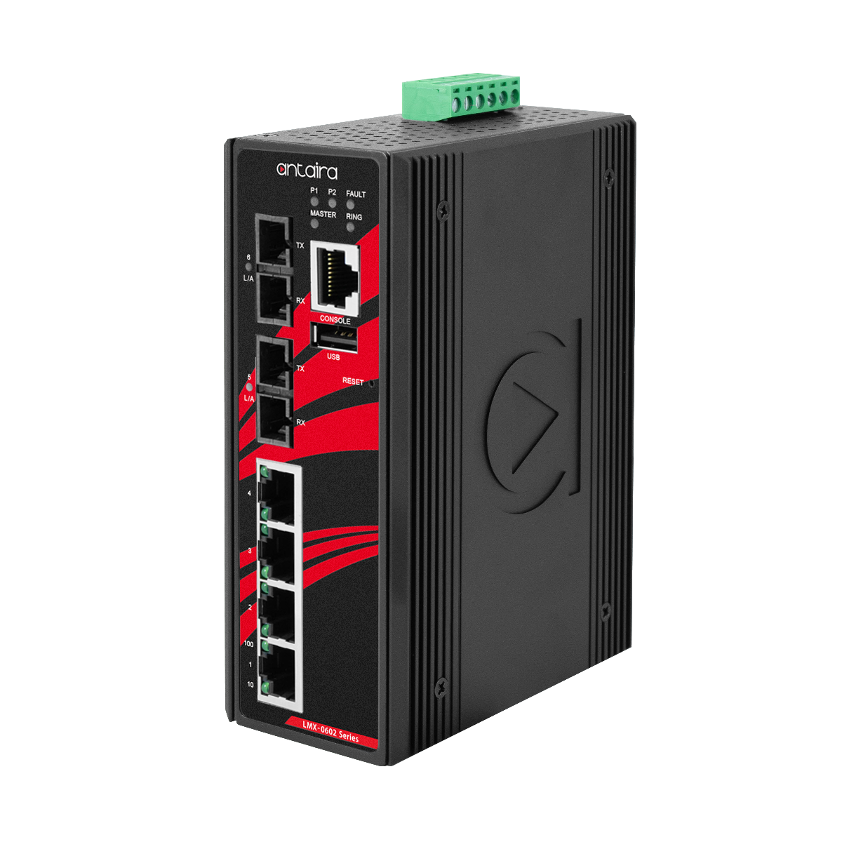 LMX-0602-M-V2 6-Port Industrial Light Layer 3 Managed Ethernet Switch, with 4*10/100Tx and 2*100Fx Multi-Mode 2Km, 12~48VDC Power Input; Version 2 Hardware.