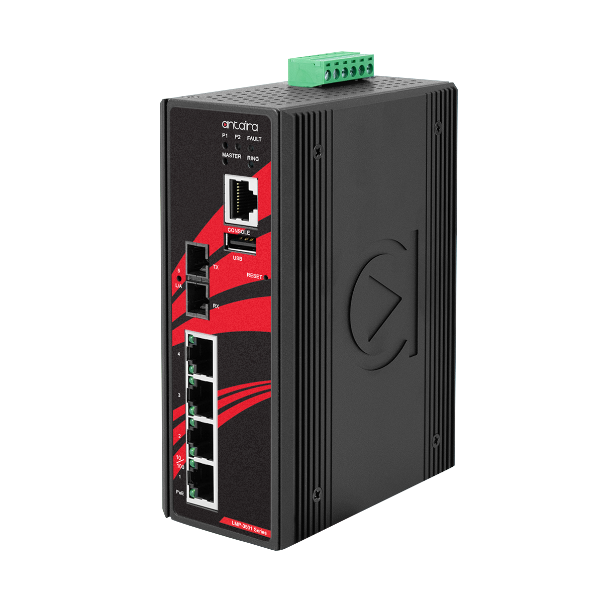 LMP-0501-ST-S3-V2 5-Port Industrial PoE+ Managed Ethernet Switch with 4*10/100Tx (30W/Port) and 1*100Fx Single Mode 30Km, ST connector - Version 2 Hardware.