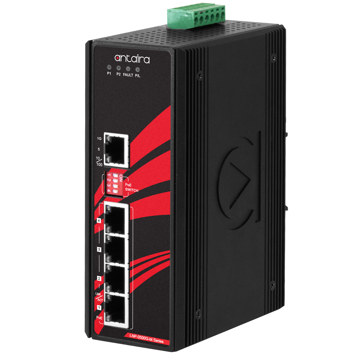 LNP-0500G-BT 5-Port Industrial Gigabit IEEE 802.3bt PoE++ Unmanaged Ethernet Switch, w/4*10/100/1000Tx (90W/Port) and 1*10/100/1000Tx.