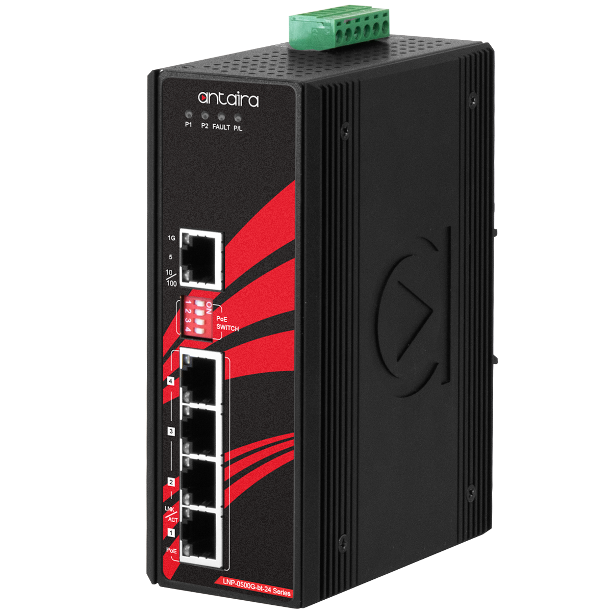Antaira Technologies LNP-0501-ST-M-24 5-Port Industrial PoE+ Unmanaged Ethernet Switch, 4*10/100Tx (30W/Port) + 1*100Fx Multi-mode 2Km, ST Connectors, 12VDC-36VDC operating temperature of -40ºC to 75ºC Industrial Ethernet Switch.