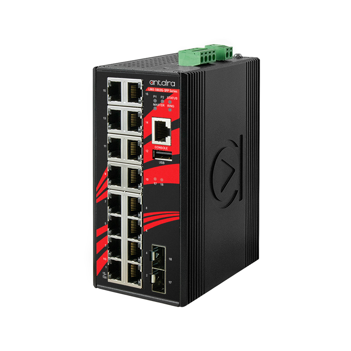LMX-1802G-SFP 18-Port Industrial Gigabit Light Layer 3 Managed Ethernet Switch, w/16*10/100/1000Tx Ports + 2*100/1000 SFP Ports operating temperature -40ºC to 75ºC.