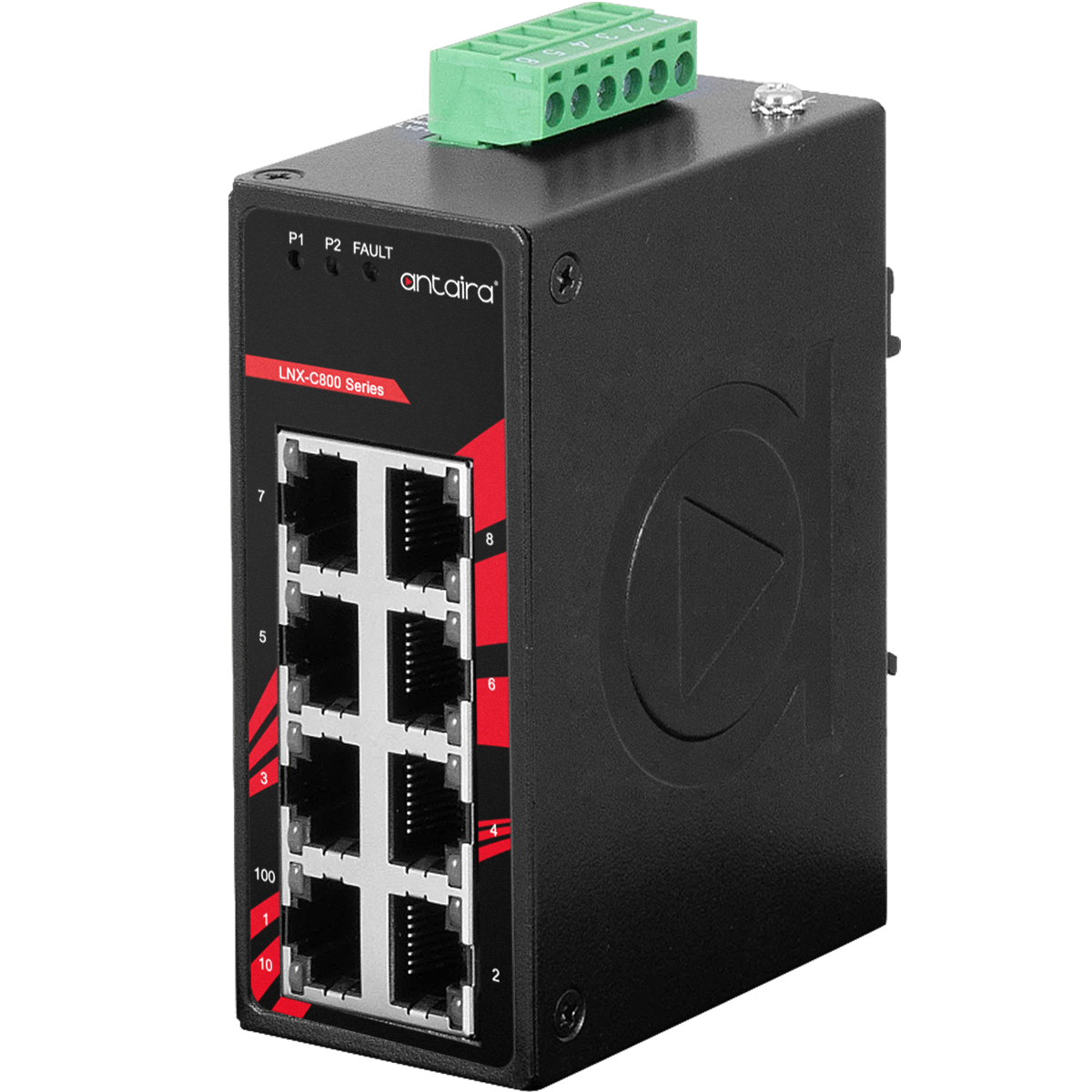 LNX-C800-T 8-Port 10/100TX Compact Industrial Ethernet Switch operating temperature of -40ºC to 75ºC.